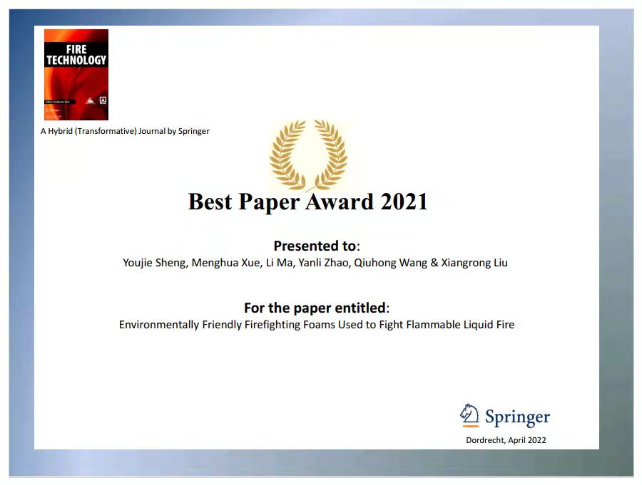 近日,美国消防协会和消防工程师协会会刊《Fire Technology》公布了2021年度最佳论文入选名单,英国上市公司365青年教师盛友杰的文章“Environmentally Friendly Firefighting Foams Used to Fight Flammable Liquid Fire”获得了该期刊2021年度最佳论文奖,华人作者发表的论文仅此一篇入选。