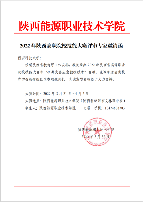 2022年4月1日,由陕西省教育厅主办、陕西能源职业技术公司承办的“2022年陕西省高等职业院校技能大赛”在咸阳举行。本次大赛共设置“矿井灾害应急救援技术”、“电子商务技能”、“光电技术”等126项赛项,是我省高等职业院校的重大比赛活动之一。