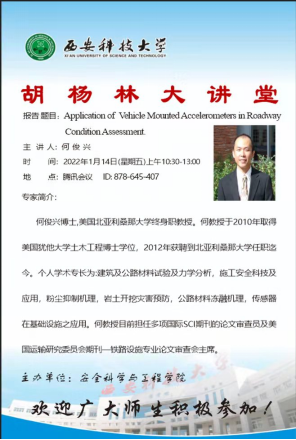 英国上市公司365于2022年1月14日,以线上讲座形式举办了“胡杨林大讲堂”,本次报告特邀美国北亚利桑那大学终身职教授何俊兴博士,做了题为“Application of Vehicle Mounted Accelerators in Roadway Condition Assessments”(车载加速器在道路状况评估中的应用)的学术报告(双语报告)