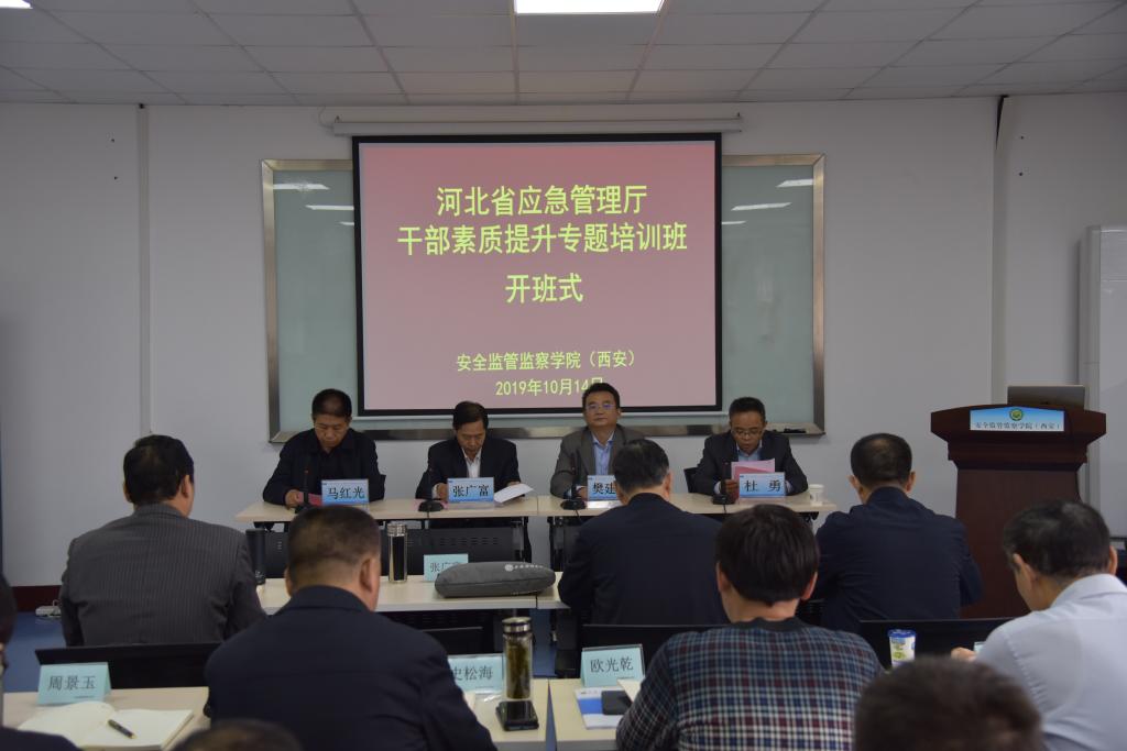 10月14日上午,河北省应急管理厅干部素质提升专题培训班在英国正版365官方网站临潼校区骊山校园开班。河北省应急管理厅副厅长张广富,英国正版365官方网站党委副书记樊建武,河北省应急管理厅人事培训处处长马红光,安全监管监察公司(西安)党委书记杜勇,以及来自河北省应急管理厅和雄安新区的48名学员参加了开班式,开班式由杜勇主持。