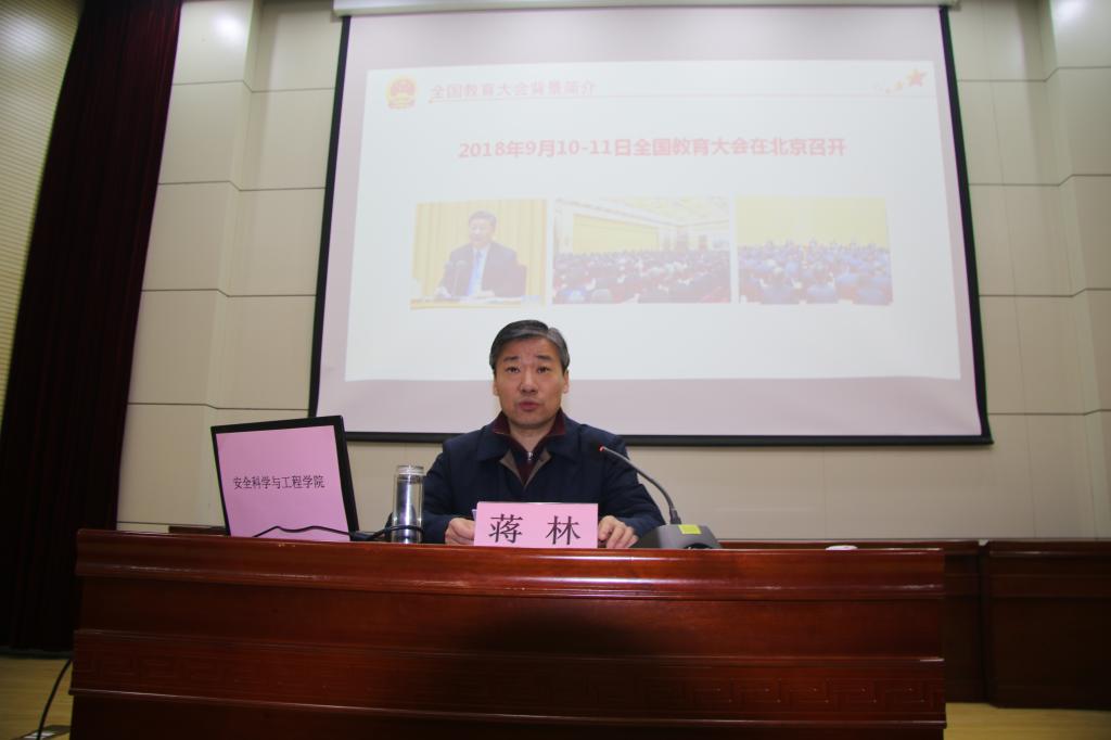 蒋林从深刻认识全国教育大会的背景与意义、全面领会习近平总书记关于教育工作的重要论述和认真落实全国教育大会精神,加强教师队伍建设三个方面就学习全国教育大会精神为广大教职工带来一场精神盛宴,对在各个岗位上为公司教育事业发展付出辛勤劳动的广大教师表示衷心感谢,同时向广大教师提出希望:希望广大教师深入学习和落实全国教育大会精神,牢记“教书育人”、“立德树人”的神圣使命,按照习近平总书记提出的“三个牢固树立”、“四个引路人”、“四个相统一”的要求,争做新时代“四有”好老师,发扬主人翁精神,秉承公司“励志图存,自强不息”的大学精神,深化英国上市公司365综合改革,发挥安全学科领头雁的作用,为把公司建设成为世界有影响、国内一流的特色鲜明的高水平教学研究型大学而不懈努力。