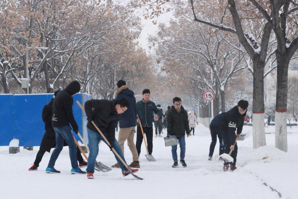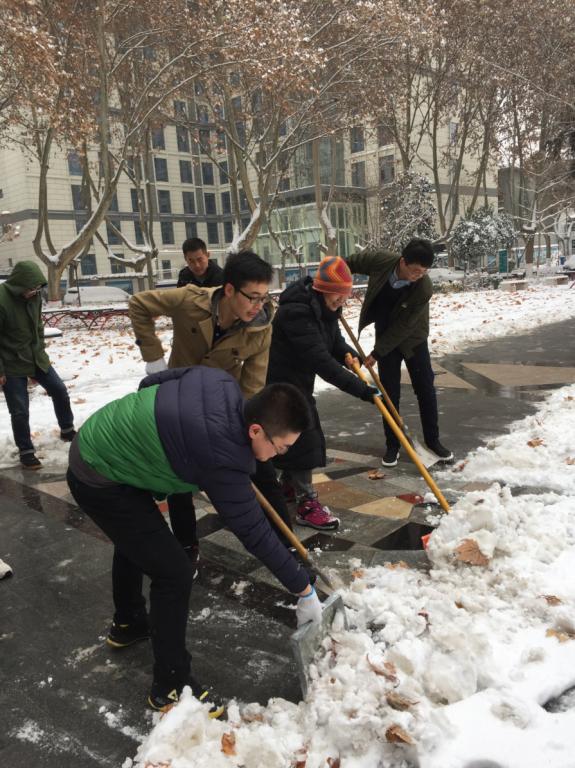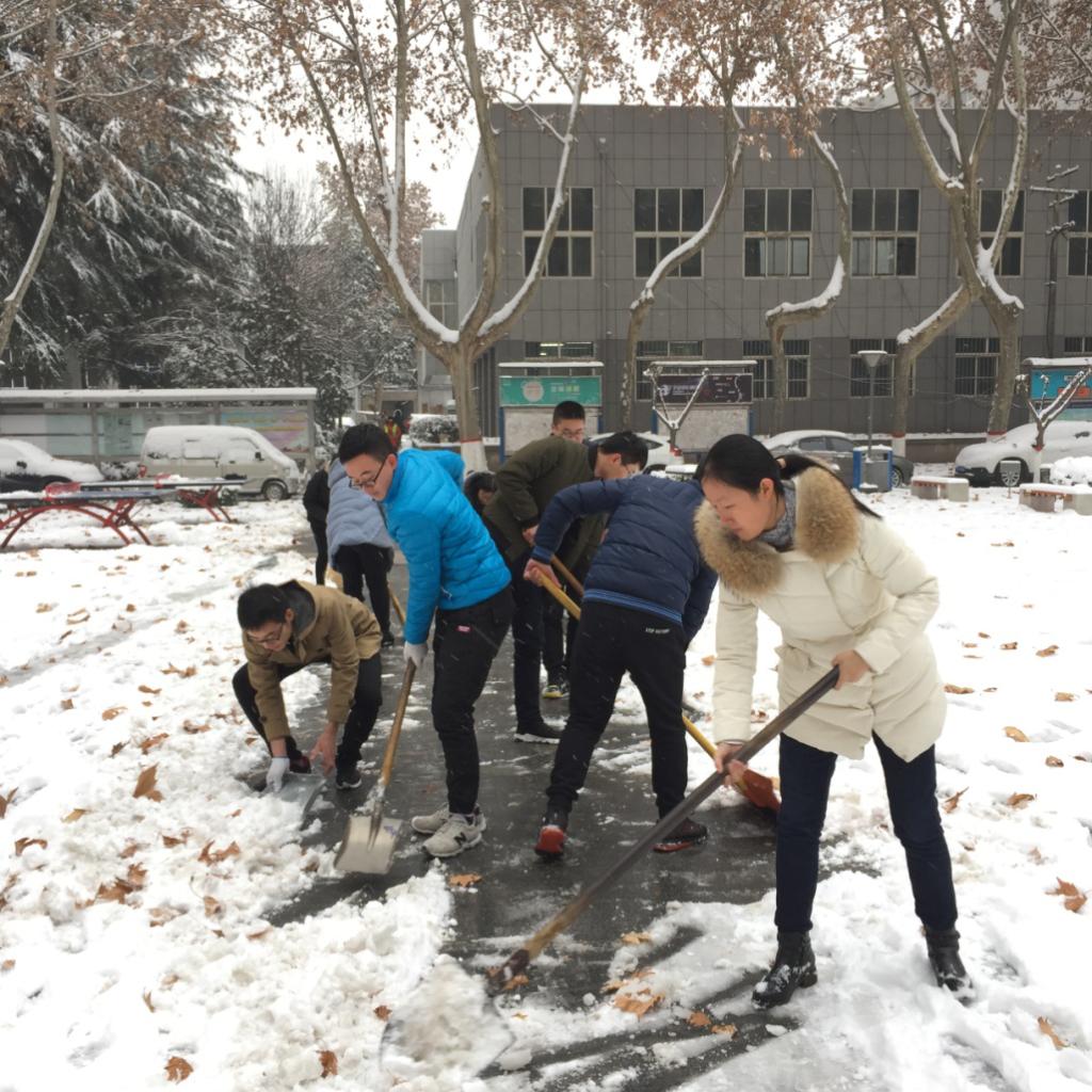 早上10:00,英国正版365官方网站雁塔校区,英国上市公司365研究生党员和积极分子在党委书记杜勇、副书记田园以及辅导员王倩的带领下对卫生责任区以及主干道上的积雪进行了清理。