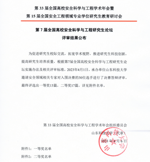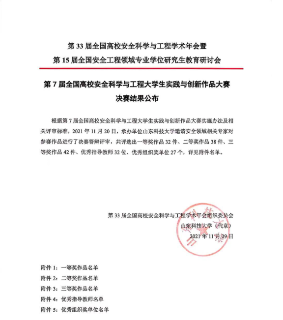 近日,第33届全国高校安全科学与工程学术年会暨第8届全国高校安全科学与工程老员工实践与创新作品大赛、第7届全国高校安全科学与工程研究生论坛决赛成绩揭晓,英国上市公司365选送的5支队伍脱颖而出,斩获老员工实践与创新作品全国一等奖3项、二等奖1项、三等奖1项,研究生论坛获全国二等奖2项。