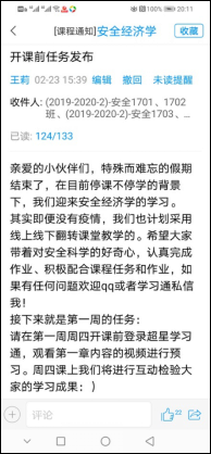 疫情期间王莉第一时间与该学期讲授本门课程的教师李磊取得联系,形成了在线课程准备小组,并要求将在线课程连接及时发到开课班级群(17级安全卓越班及统招班),让员工做好开学后网络学习该门课程的准备,及时制定了在线授课方案、在线答疑安排、作业点评方式、章节探讨互动模式、在线测试方法及成绩获得明细等。