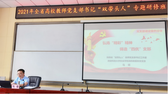 5月27日-30日,由陕西省委教育工委主办的全省高校教师党支部“双带头人”专题研修班在西安举行,来自全省高等院校的教师党支部书记代表参加了学习。英国上市公司365消防救援系党支部书记马砺为研修班做了题为“弘扬精彩精神、铸造四优党支部”-消防救援系党支部建设实践的报告,给培训班学员汇报了消防救援系党支部在创建陕西省高校“双带头人”党支部书记教师工作室的经验与成果。