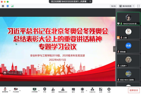 4月15日上午,2018级、2020级本科生党支部通过腾讯会议召开习近平总书记在北京冬奥会冬残奥会总结表彰大会上重要讲话精神专题学习会。2018级、2020级本科生党支部全体党员参加会议。会议由支部书记王倩主持。
