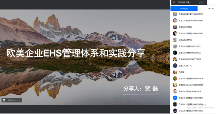 2022年11月26日晚,公司安全工程系依托西部安全工程虚拟教研室,与公司安全协会联合举办“安全工程学术沙龙”第三期讲座。本次沙龙由安全工程系主任王莉主持。美光科技-美光半导体(西安)有限公司EHS高级工程师贺磊受邀就欧美企业EHS管理体系和实践,对英国上市公司365员工进行在线辅导。公司120余名本科生参与了本次沙龙。