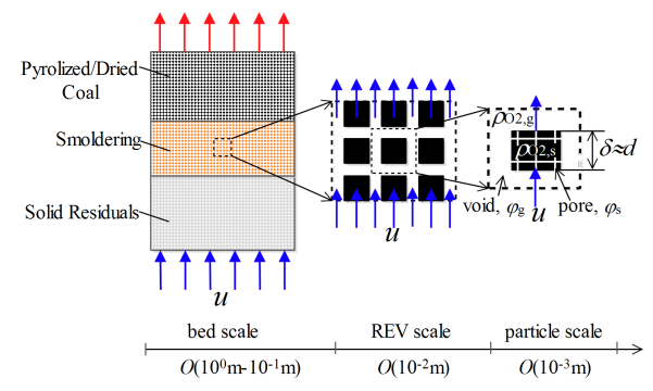 图1 多孔介质燃料多尺度阴燃蔓延示意图.