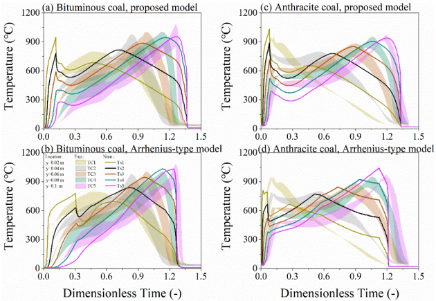 地下煤火是威胁煤矿安全生产和污染环境的全球性灾害,我国是受灾最为严重的国家之一。地下煤火蔓延预测对地下煤火灾害防治具有重要的理论指导意义,但是目前阴燃蔓延模型还存在两点仍未解决的关键科学问题:(1)基于Arrhenius汇项的氧气组分运输方程并不能解决气固两相之间氧气非均衡矛盾;(2)不能对蔓延动态过程的动力学/供氧控制机制进行分析。针对以上问题,该研究从颗粒尺度(如图1所示)的多孔介质气固两相的氧气组分运输方程出发,推导出了适用于燃料层尺度(如图1所示)考虑阴燃动力学反应-供氧控制机制的氧气组分运输方程,它将气固两相氧浓度非均衡方程(两个守恒方程)简化为氧浓度均衡方程(一个守恒方程),但同时又能反应气固两相氧气浓度非均衡的特征,且能提高计算收敛性和计算效率。图2对比了提出的模型计算结果(上面两个图中的实线)与传统模型计算结果(下面两个图中的实线)以及实验结果(图中的阴影区域)。由图可知,提出的模型比传统模型能更好地预测地下煤火自维持阴燃蔓延。