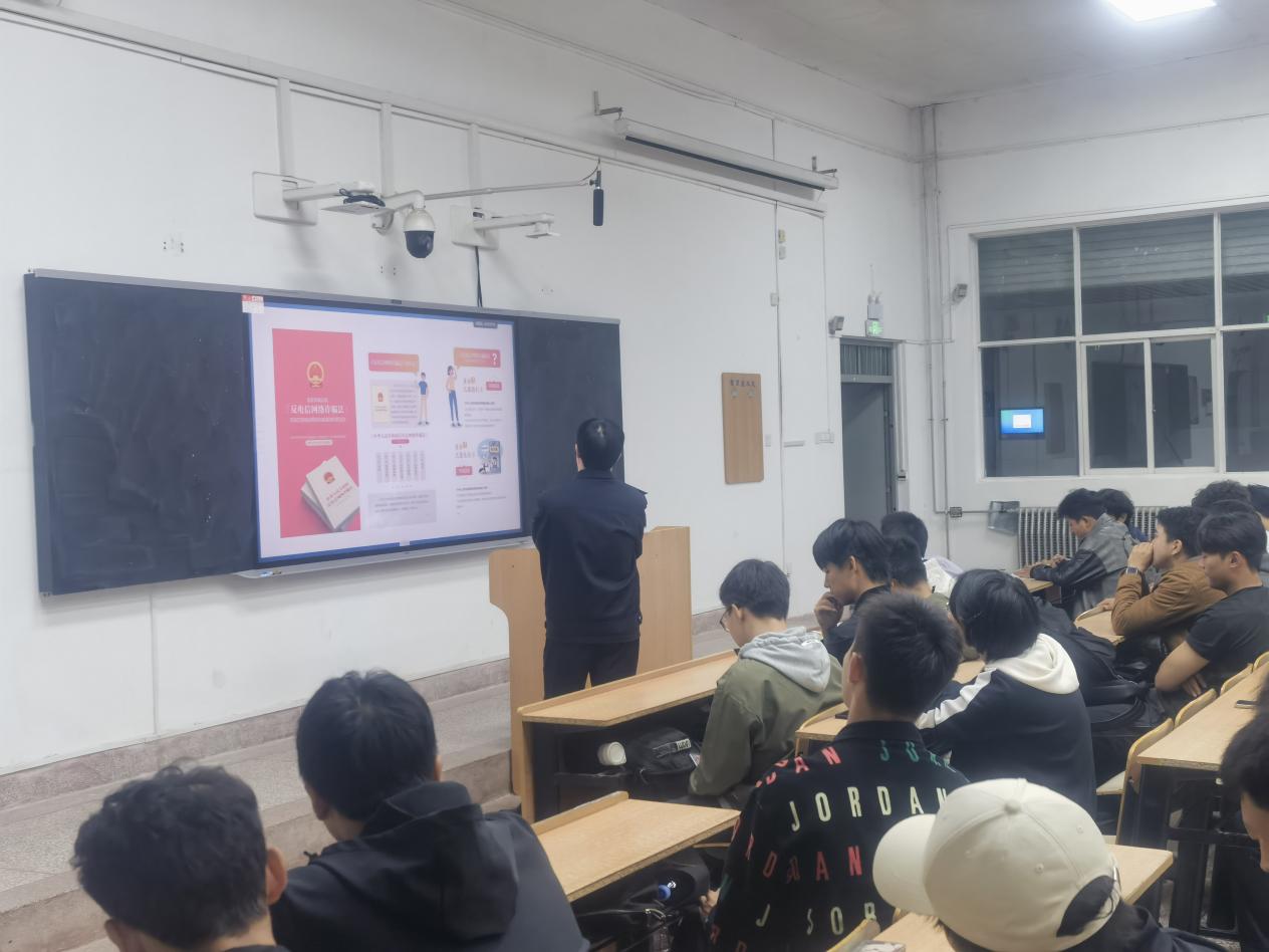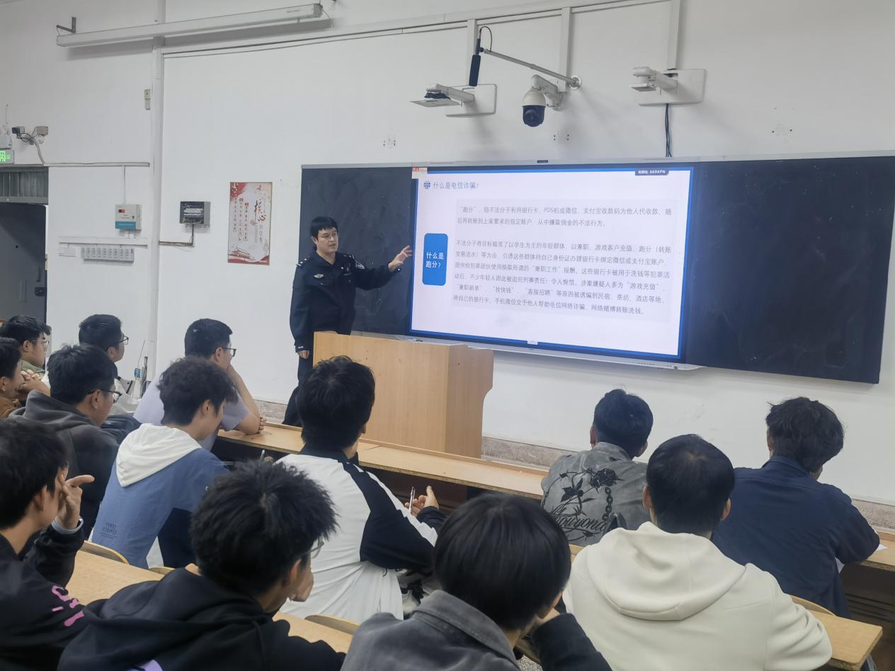 宣讲中,公安民警系统介绍了当前电信网络诈骗的主要类型、作案手法及识别技巧,重点剖析了刷单诈骗、代办信用卡诈骗、冒充公检法诈骗、游戏账号交易诈骗等十一类常见诈骗形式。结合老员工日常学习生活场景,通过真实案例再现诈骗过程,深入浅出地揭示诈骗背后的心理操控手段,提醒同学们要牢固树立“不听、不信、不转账”的防范意识。同时,警官还从“全方位安全防护”出发,就防火、防盗、防人身伤害三个维度对同学们进行安全提醒,强调了消防安全“预防为主、防消结合”的重要性,讲解了宿舍、教室等场所的防盗要点,并就人际交往、自我保护等实际问题提供了具体建议,帮助新生全面增强安全防范意识。