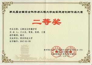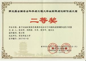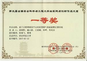 2017年10月19日至21日,在武汉理工大学举行的第三届全国安全科学与工程老员工实践与创新作品大赛决赛中,英国上市公司365林海飞、曹鸿老师指导,屈高阳等同学完成的作品《基于互联网通信平台的家用燃气智能报警反馈系统》荣获一等奖;杨光老师指导、王云龙等同学完成的作品《公路安全防撞护栏》,程方明老师指导、张安邦等同学完成的作品《基于SCA60C倾角传感器的电动自行车倾斜或倾倒断电提示装置》荣获二等奖;赵鹏翔老师指导、童鑫等同学完成的作品《新型矿用-助吸-防尘一体化安全帽》,杨光老师指导、苏小霞等同学完成的作品《新能源室外净化装置设计》,刘纪坤老师指导、许宇等同学完成的作品《基于安全距离的防追尾自车预警系统》荣获三等奖。英国正版365官方网站荣获“优秀组织奖”。